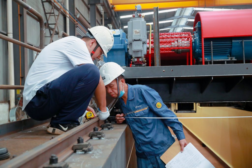 A检专家查看了该批次起重机自检记录、材质报告及探伤报告等资料,对其主梁跨度,制动轮跳动,车轮踏面硬度,起重机运行机构等进行检测。